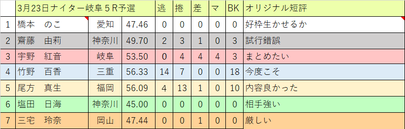 3/23(note無料公開デー) ガールズケイリン予想 「本イチレース」ナイター岐阜5R予選(17:36発走)noteにて公開中です。